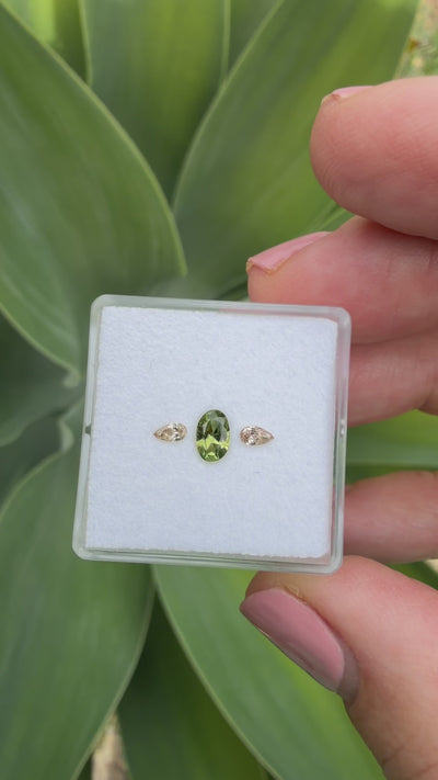 0.55 ct Australian Parti-Sapphire in a green/yellow colour mix with 2 = 0.10 ct Argyle Champagne Diamond Pear Shaped sides. This set is pecial as all the stones are Australian Origin making it perfect for the collector or anyone wanting to own a piece of Australian History