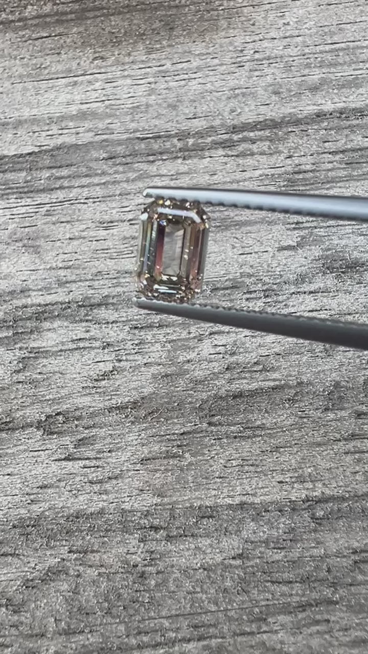 1.12 ct Emerald Cut C1 Light Champagne Coloured Diamond. We love this for its lighter colour and it is a nice clean stone with a VS1 Clarity Grade - important for an Emerald Ctu due to it's open facets.