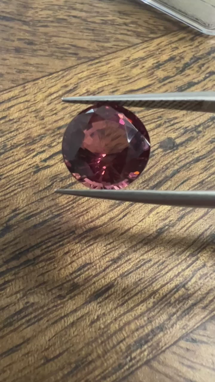 5.87 ct Round Brilliant Cut Orangy Pink Tourmaline. This is a super impressive, large carat weight Tourmaline in a gorgeous colour.